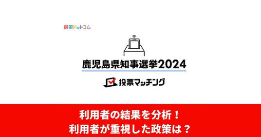7月7日投開票の鹿児島県知事選挙で、選挙ドットコム(運営:イチニ株式会社 代表取締役 高畑卓)は南日本新聞社と共同で、自分の考えがどの候補者に近いかを調べられる「鹿児島県知事選挙2024投票マッチング」を告示日の6月20日にリリースし、これまで約9000人を超える方にご利用いただきました。今回の投票マッチング利用者の年代別の割合や、利用者が重視した政策などを取りまとめ、結果を分析しました。