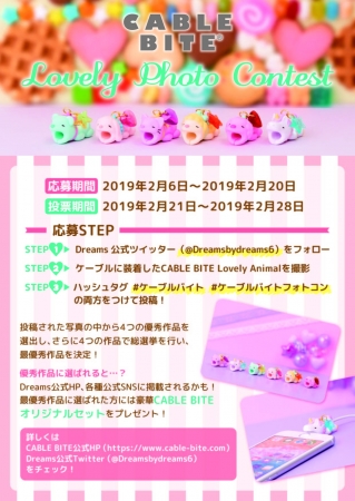 株式会社ドリームズ(本社:東京都新宿区/代表取締役 添谷徹)は、2019年2月6日(水)からCABLE BITE LOVELY PHOTO CONTESTを開催致します。