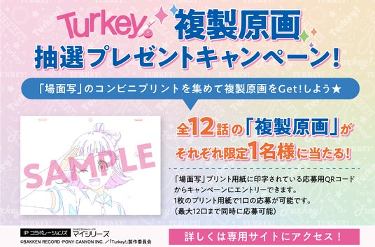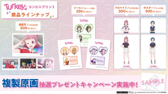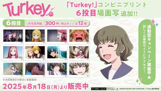 この『Turkey!』コンビニプリントでは、放送終了後の翌週(次話放送の前日)に各話より厳選された12点の「場面写」をL判写真用紙でプリントできる「場面写」、各キャラクターデザインの「シール」、「ポスター&ブロマイド」の3種類のプリントが楽しめます。