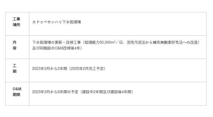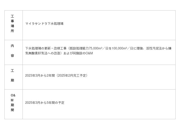 今回受注したプロジェクトは人口増加に対応する下水道インフラの増強及び新たな放流水質基準に対応することを背景として形成されたプロジェクトです。