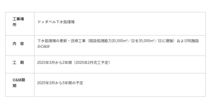 更新・改修及びO&M契約を受注したのはインド南部カルナタカ州ベンガルール都市圏向けのカドゥベサンハリ下水処理場、マイラサンドラ下水処理場、ドッダベル下水処理場で、処理能力の増強及び従来の下水処理方式である活性汚泥法から高度処理の嫌気無酸素好気法(A2O法)への改造による下水処理水質の改善を行います。その他ベンガルール都市圏に点在する下水処理場5カ所についても部分更新・改修の契約を受注しています。