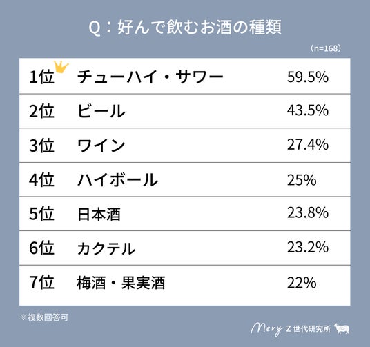 「好んで飲むお酒の種類」のアンケートでは、「チューハイ・サワー」(59.5%)が、ビール(43.5%)を上回り、トップという結果となった。