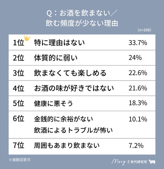 また、「月1~3回」「月1回未満」「飲まない」と回答した方を対象に「お酒を飲まない/または飲む頻度が少ない理由」を聞いたところ、33.7%が「特に理由はない」と回答した。