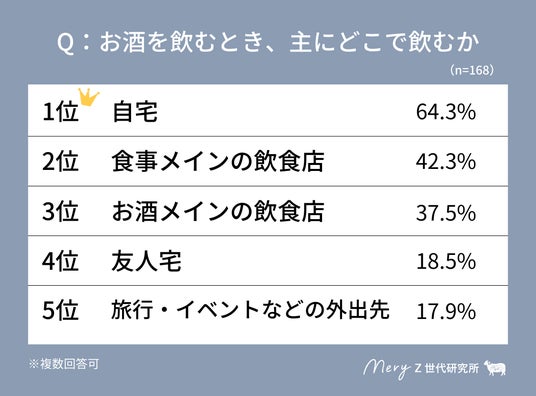 次に、お酒を飲む習慣がある方を対象に、「主にどこで飲むか」「主に誰と飲むか」を聞いたところ、場所は「自宅」(64.3%)、人は「家族」(42.9%)と飲む人が最も多いことがわかった。