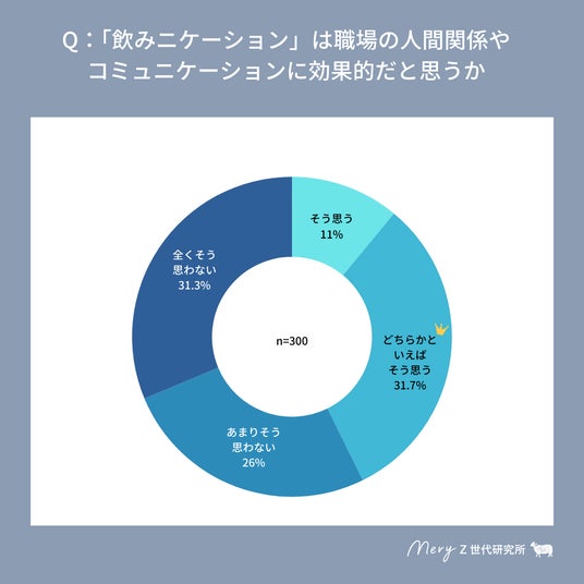 「『飲みニケーション』が職場の人間関係やコミュニケーションに効果的だと思うか」という質問では、「どちらかといえばそう思う」(31.7%)と「全くそうは思わない」(31.3%)がほぼ同率という結果に。