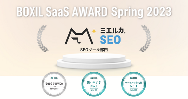 「BOXIL SaaS AWARD(ボクシル サース アワード)」は、SaaS比較サイト「BOXIL SaaS(ボクシル サース)」を運営するスマートキャンプが、優れたSaaSを審査、選考、表彰するイベントです。今回の「BOXIL SaaS AWARD Spring 2023」は、2022年1月1日から2022年12月31日までの1年間で新たに投稿された口コミ約14,000件を審査対象としており、「ミエルカSEO」は「SEOツール部門」で 「Good Service」、「使いやすさNo.1」、「サービスの安定性No.1」に選ばれました。