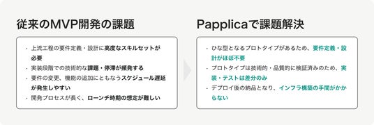 「Papplica」は、パターンオーダー方式のMVP開発サービスです。独自に標準化されたモジュールを組み合わせて、短期間で高機能なMVPを構築します。技術的負債を最小限に抑えつつ、高速な仮説検証サイクルを実現します。