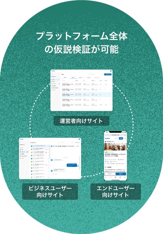 通常、MVPは時間・資源的制約から、メインとなるユーザーのみに絞って構築を行うことが一般的ですが、Papplicaが提供するMVPでは、サービスに関わる全てのステークホルダーに対して固有のサイトが提供されます。エンドユーザー・ビジネスユーザー・運営者、それぞれに対してを備えたサイトを提供することで、プラットフォーム全体の仮説検証が可能です。