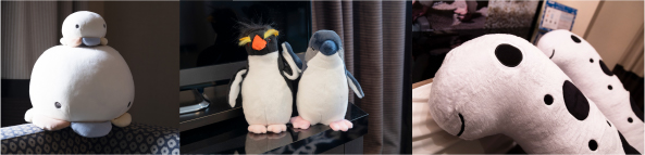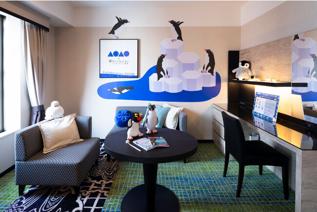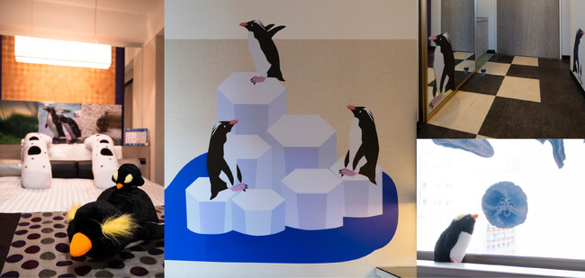 客室の扉を開けると足元には水族館の主役イワトビペンギンがお出迎えしお部屋までエスコート。