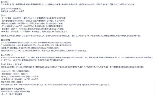 - 詳細な診断レポート: 想定されるリスクと被害額、訴訟費用や個人情報被害などの内訳、漏洩時の具体的なシナリオ・リスク、脆弱性対策・再発防止策事例など、詳細な診断結果をメールでお届けします。