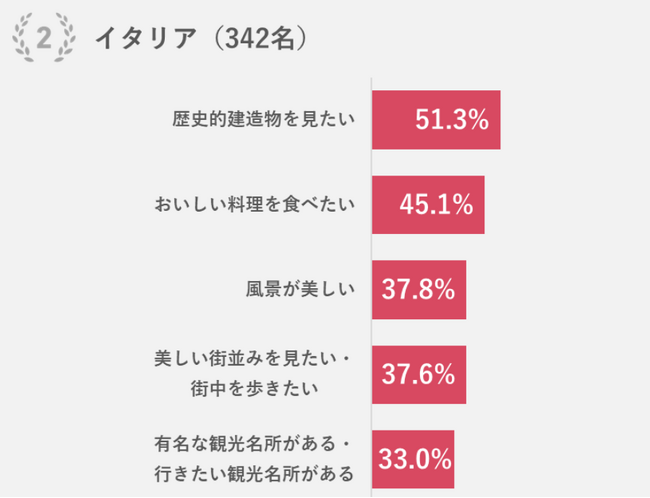 理由1位は「歴史的建造物を見たい」(51.3%)、2位は「おいしい料理を食べたい」だった。点在する世界遺産に魅了される声のほか、日本人にも身近な「イタリアンを本場で味わいたい」という声も複数見られた。旅行経験は29.3%。