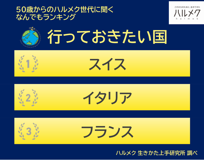 女性誌販売部数No.1(※1)の雑誌「ハルメク」をグループで発行する株式会社ハルメクホールディングス(本社:東京都新宿区、代表取締役社長:宮澤 孝夫)ハルメク 生きかた上手研究所は、50歳以上の女性(事前調査513名、本調査506名)へのアンケート結果をもとにした「50歳からのハルメク世代に聞く なんでもランキング」を公開しています。今回は「行っておきたい国」です。