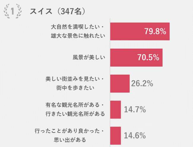 行っておきたい理由は「大自然を満喫したい・雄大な景色に触れたい」「風景が美しい」が圧倒的に高く、7割を超えた。マッターホルンをはじめとする自然や世界遺産である首都ベルンの街並みなどに憧れを抱く人が多かった。60代以上で1位だった。旅行経験は18.6%。