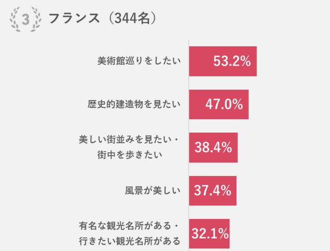 理由1位は「美術館巡りをしたい」(53.2%)で、20か国・地域の中でも圧倒的に高かった。2位は「歴史的建造物を見たい」、3位は「美しい街並みを見たい・街中を歩きたい」だった。旅行経験は34.7%。