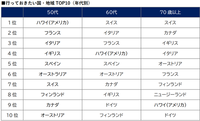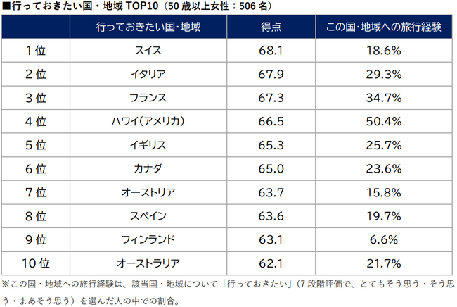 人生を折り返した50歳以上女性が「行っておきたい国」はどこなのでしょうか。