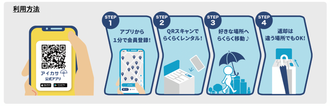 「アイカサ」とは、2018年12月にサービスを開始した、日本初の傘のシェアリングサービスで、レンタルスポットを設置してある場所であればどこでも傘を借用、返却できるサービスです。