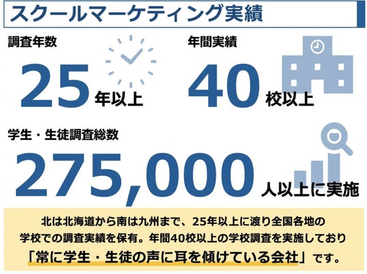 「スクール」分野では25年以上の実績を有しています。これまでに年間40校以上、累計275,000名以上の生徒・学生を対象とした調査を実施してきました。