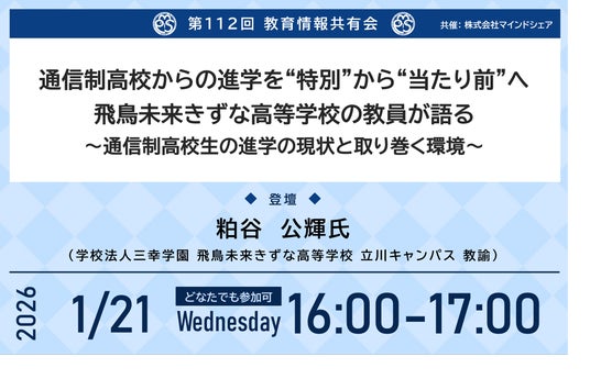 第112回となる今回は「通信制高校からの進学を“特別”から“当たり前”へ 飛鳥未来きずな高等学校の教員が語る ~通信制高校生の進学の現状と取り巻く環境~」というテーマで、飛鳥未来きずな高等学校 立川キャンパス 粕谷 公輝氏よりお話しいただきます。