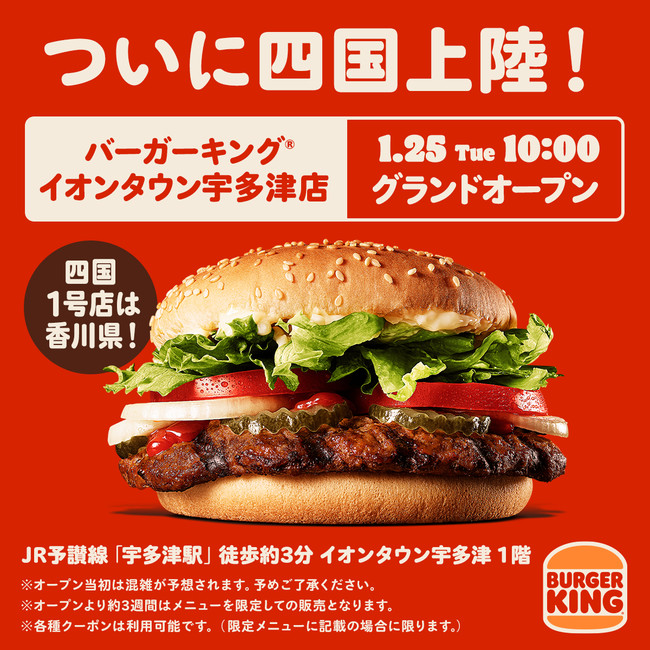 1月25日(火)に、ついにバーガーキング(R) が四国に上陸。香川県綾歌郡宇多津町に四国1号店となる「バーガーキング(R) イオンタウン宇多津店」をグランドオープンいたします。
