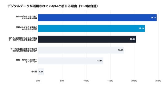 デジタルデータを活用できていない理由を調査したところ、データの検索性の悪さ、情報の不確かさ、部門ごとの分散管理が主な要因として挙げられました。