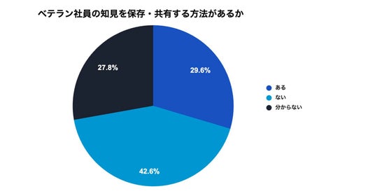 調査では、ベテラン社員の知見を保存・共有する方法が「ある」と答えたのはわずか29.6%。一方で、「ない」「分からない」で約7割に達しており、知見が組織的に共有・保存されていない実態が明らかに。