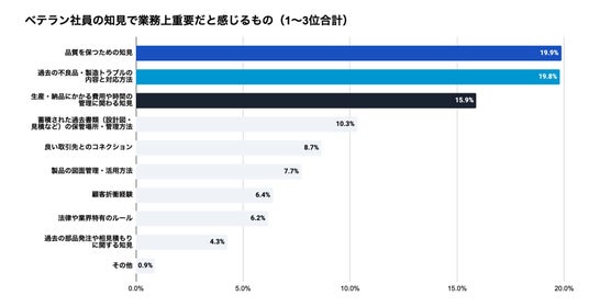 製造業界のベテラン社員が持つ知見は多数ある中で上位3項目で55.6%を占めており、これらを継承していくことの重要性が明らかとなった。