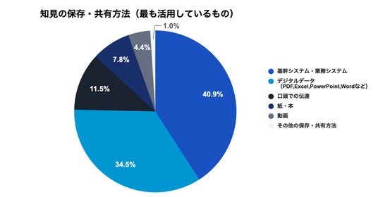 ● 知見共有の方法が存在する場合でも、基幹システム・業務システムの活用は40.8%と半数以下に留まっており、多くの企業がExcel等のデジタルデータや口頭での伝達に依存している状況が判明。
