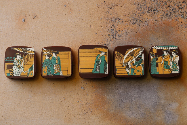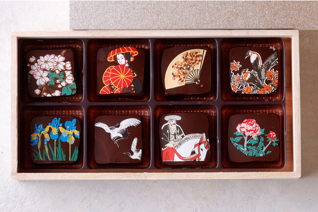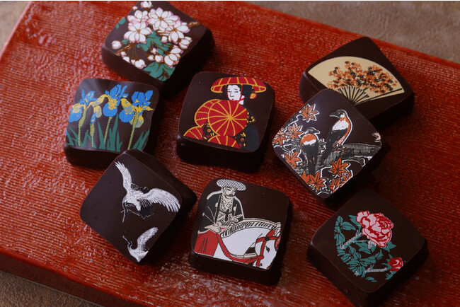 【内 容】ホテルの天井や壁を彩る花鳥画や美人画、江戸時代の参勤交代をモチーフにした彫刻からのひとコマを切り取った大名など、8つの景色をショコラに写し取りました。