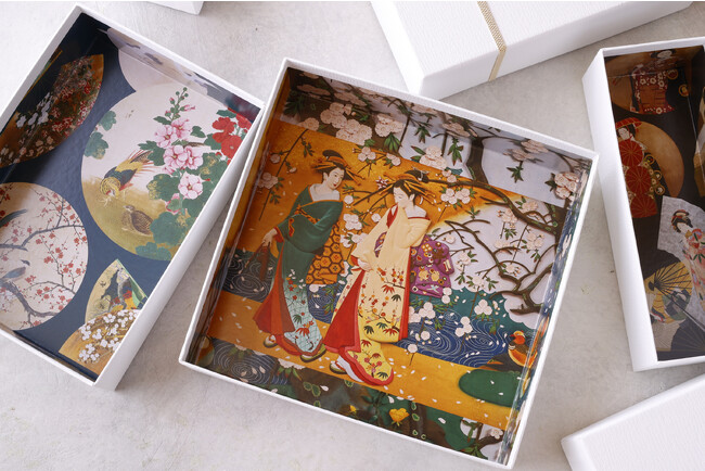 この度の、ホテル外への常設店舗の初出店を記念し、ホテル雅叙園東京のアートを東京・目黒から全国各地の皆さまにお届けしたいという想いから、「持ち帰れるアート」をコンセプトに、ショコラとクッキー缶を新発売いたします。天井画ショコラ「八景」は、ホテル内の日本画や彫刻から8つの美しい景色をセレクトしました。そのフレーバーには、「トロピカルペッパー」や「カシスフィグ」など、プティガトーのような華やかさを小さなひと粒に込めたり、「山椒」、「ほうじ茶」、「紫蘇」など和素材を取り入れたりと、パティシエのこだわりが詰まっています。また、クッキーにもホテル内に実在する美術品を取り入れ、5種のデザイン缶をご用意いたしました。