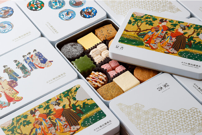 【内 容】 日本画や美術工芸品に彩られたホテル内は、どこを切り取っても画になります。その美術品の数々から印象的な作品をモチーフにしたデザイン缶の中には、食感や味わいの異なる12種類のクッキーをぎっしりと詰め合せました。