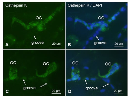 図4:低温(4℃)で1週間保管前後のウロコの破骨細胞の酵素(カテプシンK)の免疫染色。A、Bは低温保管前。C、Dは低温保管後。Grooveはウロコの骨質層に存在する溝、青白い楕円は核を示す。