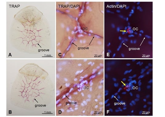 図3:低温(4℃)で1週間保管前後のウロコの破骨細胞の活性(酒石酸抵抗性酸フォスファターゼ活性:TRAP)染色。上段A、CおよびEは低温保管前。下段B、DおよびFは低温保管後。黄色の矢印が示す赤い部分がアクチンリング、Grooveはウロコの骨質層に存在する溝、青白い楕円は核を示す。