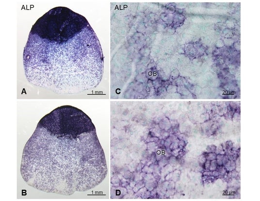図2:低温(4℃)で1週間保管前後のウロコの骨芽細胞の活性(アルカリフォスファターゼ:ALP)染色。A、Cは低温保管前。B、Dは低温保管後。CはA、DはBの拡大図を示す。