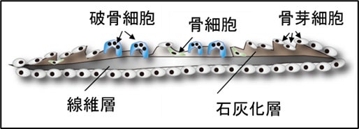 魚のウロコは、石灰化した骨基質の上に骨芽細胞と破骨細胞、さらに骨細胞が共存し、ヒトの骨と同じように骨代謝を行っている。