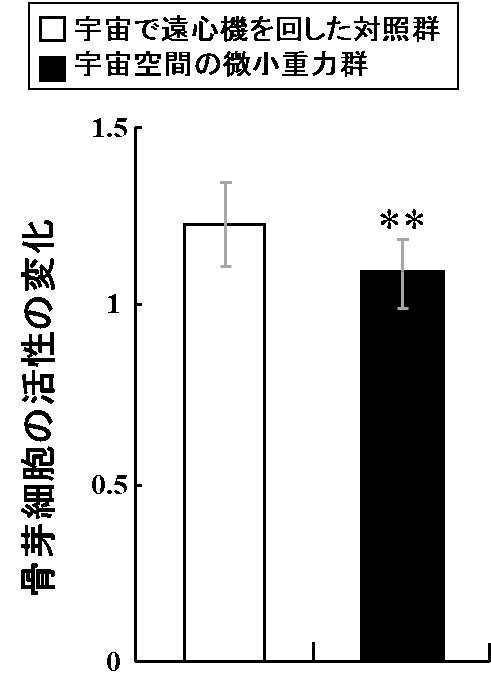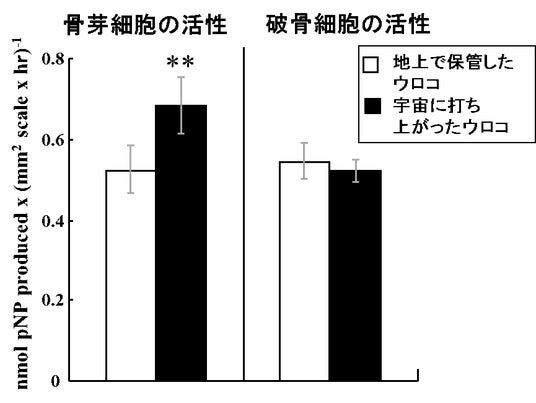 図7:低温(4℃)に保管してスペースシャトルで宇宙に打ち上げた時の振動および過重力の刺激を受けたウロコの骨芽細胞と破骨細胞の代表的な酵素活性(ALPとTRAP)の変化。 **: P < 0.01. **は統計的に有意な差があることを示す。