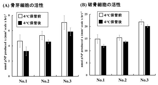 図5:低温(4℃)で1週間保管前後のウロコの骨芽細胞(A)および破骨細胞(B)の代表的な酵素活性(A: ALP、 B: TRAP)の変化