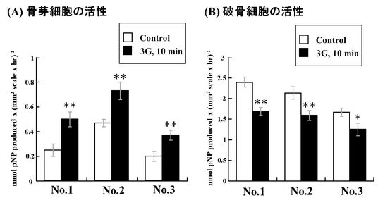 図6:低温(4℃)で1週間保管後にバイブレーションによる過重力を加えた時のウロコの骨芽細胞(A)および破骨細胞(B)の代表的な酵素活性(A: ALP、 B: TRAP)の変化。*: P < 0.05; **: P < 0.01. *、**は統計的に有意な差があることを示す。