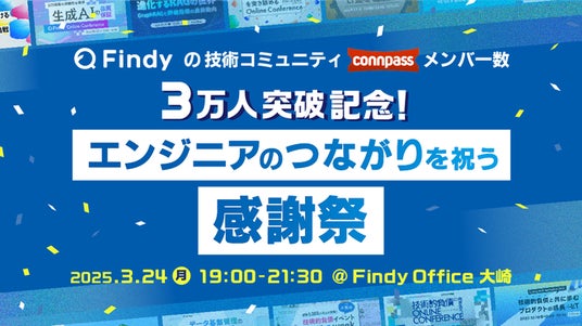 エンジニアプラットフォームを提供するファインディ株式会社(東京都品川区、代表取締役:山田 裕一朗、以下「当社」)は、IT勉強会支援プラットフォーム「connpass」のFindyグループメンバーが3万人を突破したことを発表します。3万人を記念して、2025年3月24日(月)にファインディ株式会社 本社 イベントスペースにてオフラインイベントを開催いたします。