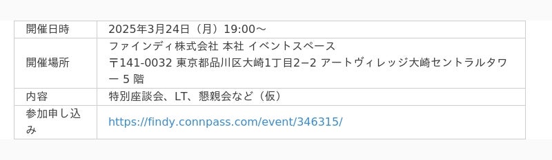 3万人を記念して、2025年3月24日(月)にファインディ株式会社 本社 イベントスペースにてオフラインイベントを開催いたします。