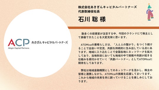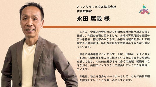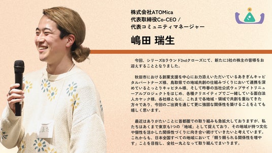ソーシャルコワーキング(R)︎スタートアップの株式会社ATOMica(本社:宮崎県宮崎市、代表取締役:嶋田 瑞生、南原 一輝、以下「ATOMica」)は、シリーズBラウンドの資金調達において、2025年6月に実施した1stクローズに続き、新たに株式会社カヤック(通称:面白法人カヤック)、株式会社あきぎんキャピタルパートナーズ、とっとりキャピタル株式会社の3社の株主を迎え2ndクローズを完了したことをお知らせいたします。