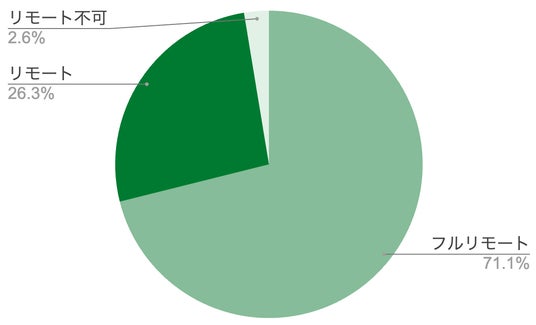 Node.jsの案件では、リモートワークが非常に一般的であることが明らかです。フルリモート(在宅OK)の案件が71.1%を占め、一部リモート可能な案件を合わせると97.4%に達します。