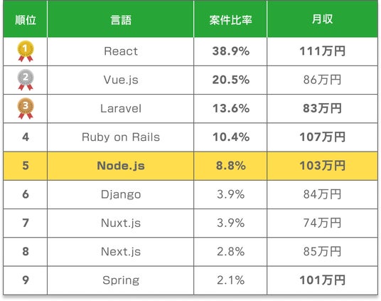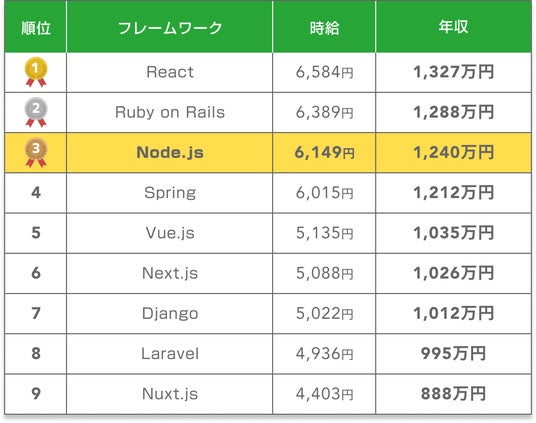 年収ランキング3位はJavaScriptフレームワークのNode.js|フリーランス副業調査