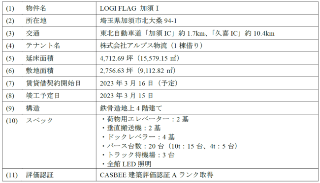 霞ヶ関キャピタル株式会社(本社:東京都千代田区、代表取締役:河本幸士郎、以下「当社」)は、当社が開発用地のソーシングおよび企画立案をおこない、アセットマネジメント業務を受託していた埼玉県加須市の物流施設開発プロジェクト『LOGI FLAG 加須I』において、株式会社アルプス物流(本社:神奈川県横浜市、代表取締役:臼居賢)にテナントが決定いたしました。なお、本日2023年3月15日に本施設の引き渡しを受け、竣工いたしましたこともあわせてお知らせいたします。