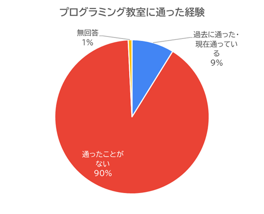 REDEEに2~3月に校外学習でやってきた小学校高学年(5~6年生)にプログラミング教育についてアンケートを取ったところ、プログラミング教室に通った経験があるのはわずか9%でした。約9割がプログラミング教室に通ったことがない、通いたいがまだ通っていないと回答しています。習いたいという希望はあるものの、実際に通うまでは何等かのハードルがあるようです。