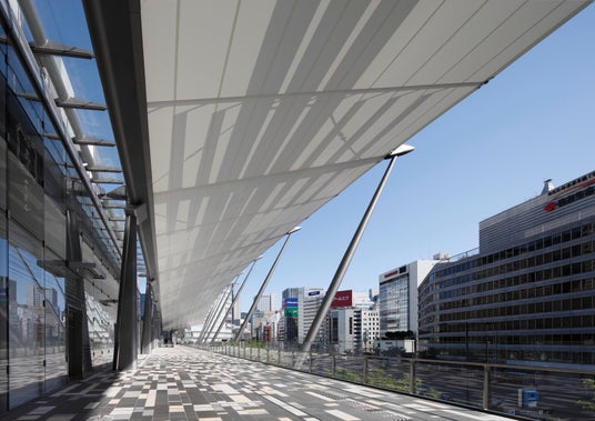 当社は、交通広場と接続する歩行者デッキに膜屋根を設け、天候の影響を受けにくい快適な滞在環境を実現しました。膜屋根の表面積は約 446 平方メートル で、透光性を備えた膜素材により、自然光を柔らかく取り込み、都市空間に明るく開放的な空間を生み出しています。