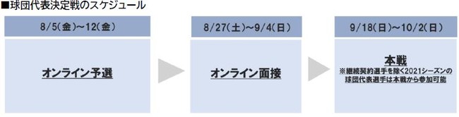 8月5日から12球団ごとに行われるオンライン予選で、上位13~15名がオンライン面接に進みます。各球団で行われるオンライン面接を通過した候補選手と、継続契約選手を除く2021シーズンの球団代表選手の計12名が9月下旬~10月上旬に行われる本戦に進出。勝ち抜いた上位2名が球団代表選手となります(継続契約選手がいない場合は、上位3名)。