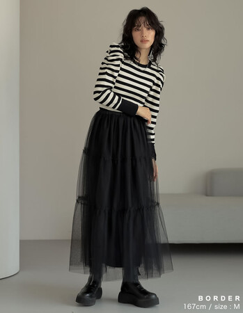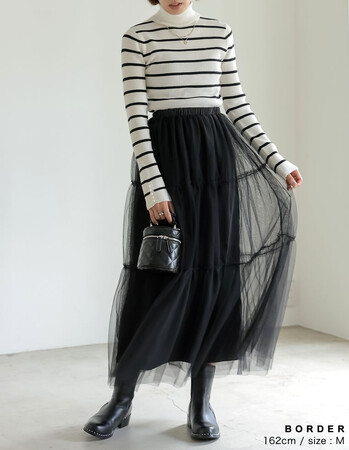 ジャンパースカートなど、旬のアイテムと合わせたレイヤードコーデも映えるリブニットです。
