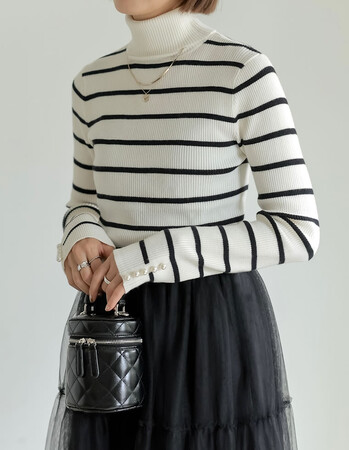 トレンドのパールデザインを袖に施したタートルリブニットトップス。