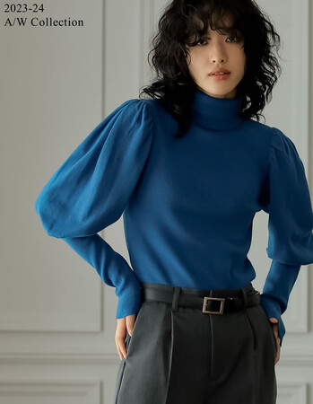 パフショルダーデザインが印象的なタートルネックニットトップス。
