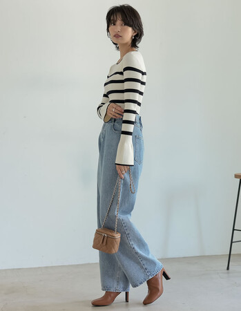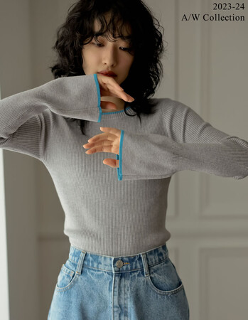 【会員様限定!1000円OFF】[2023A/W COLLECTION]クルーネックフレアスリーブ配色リブニットトップス